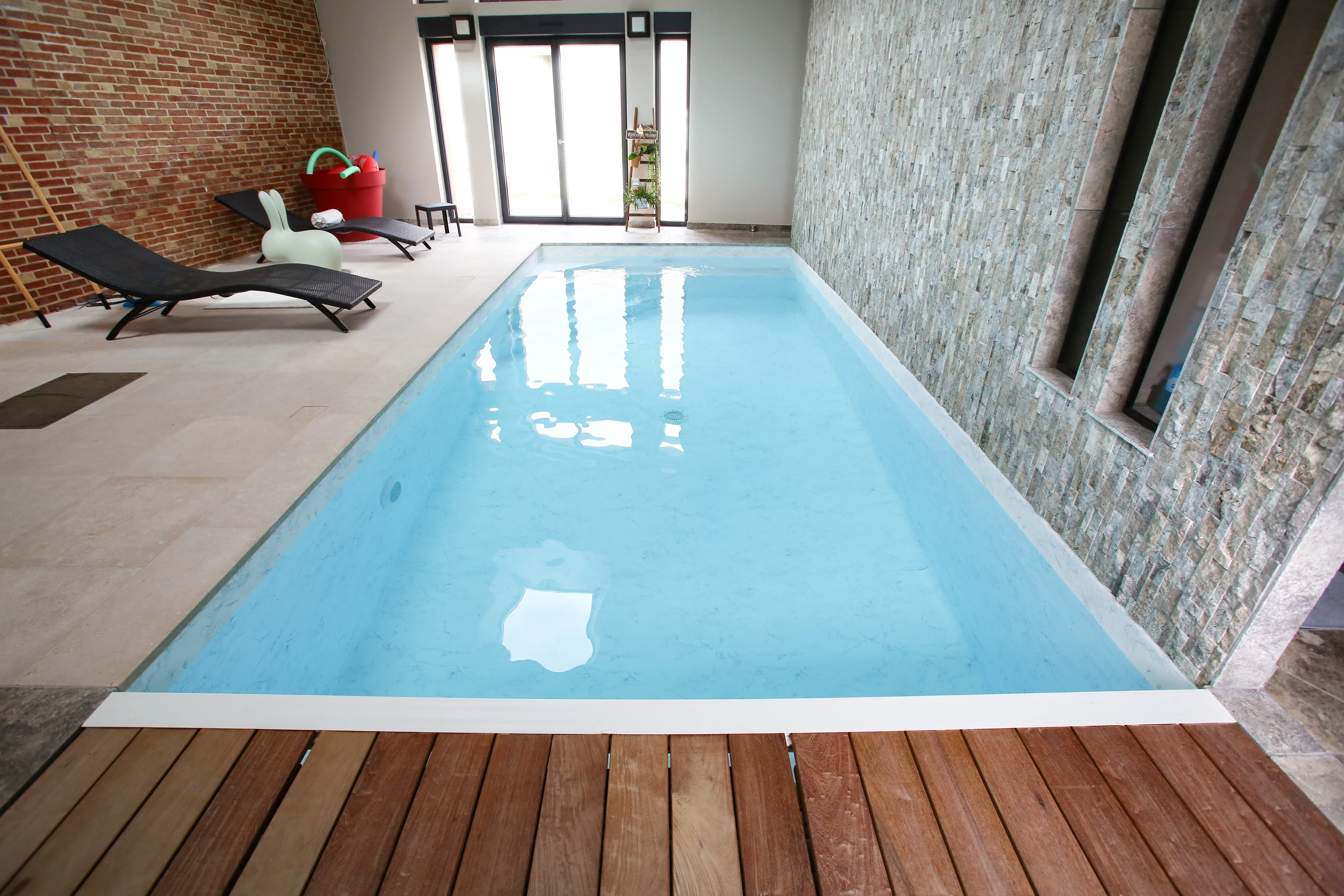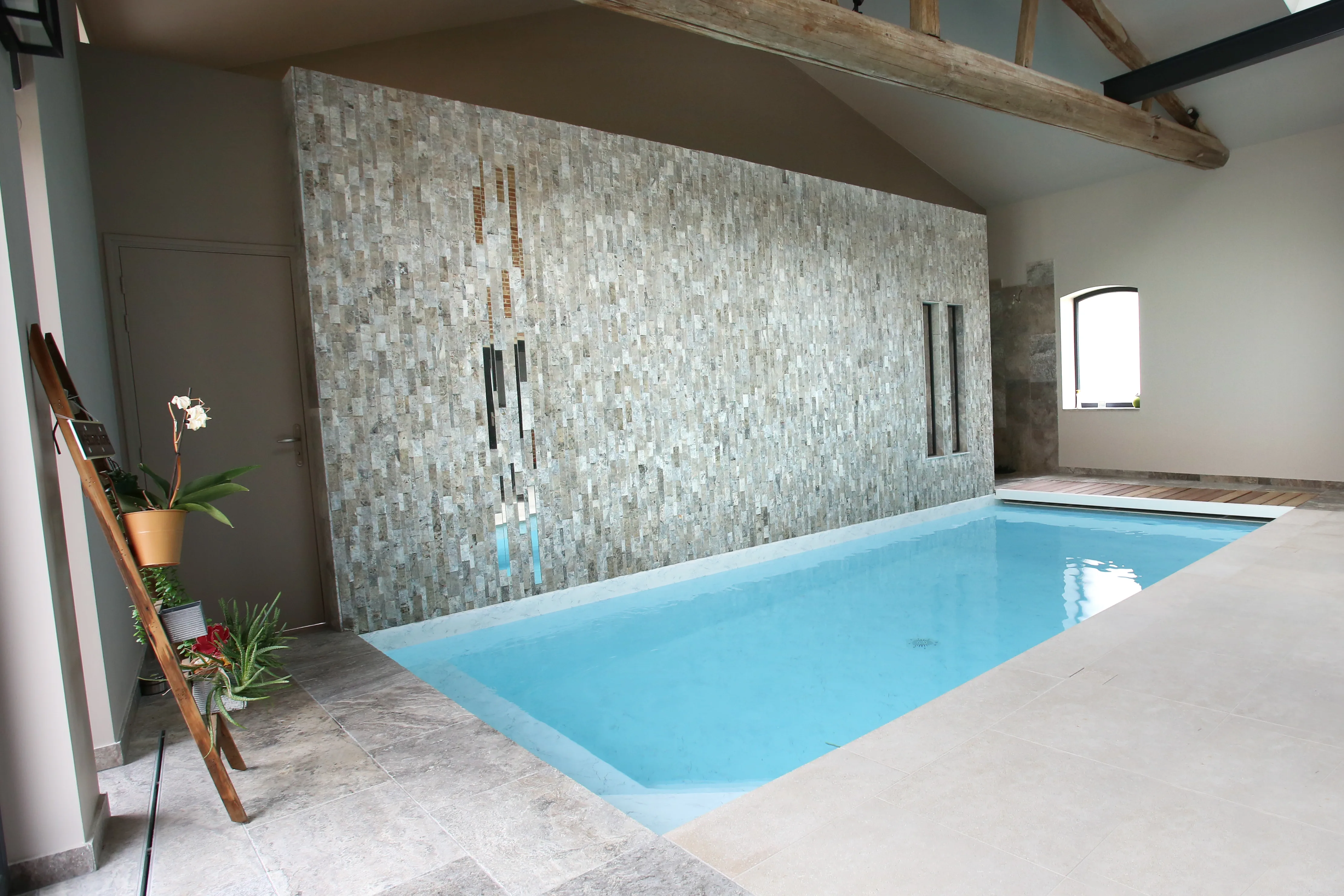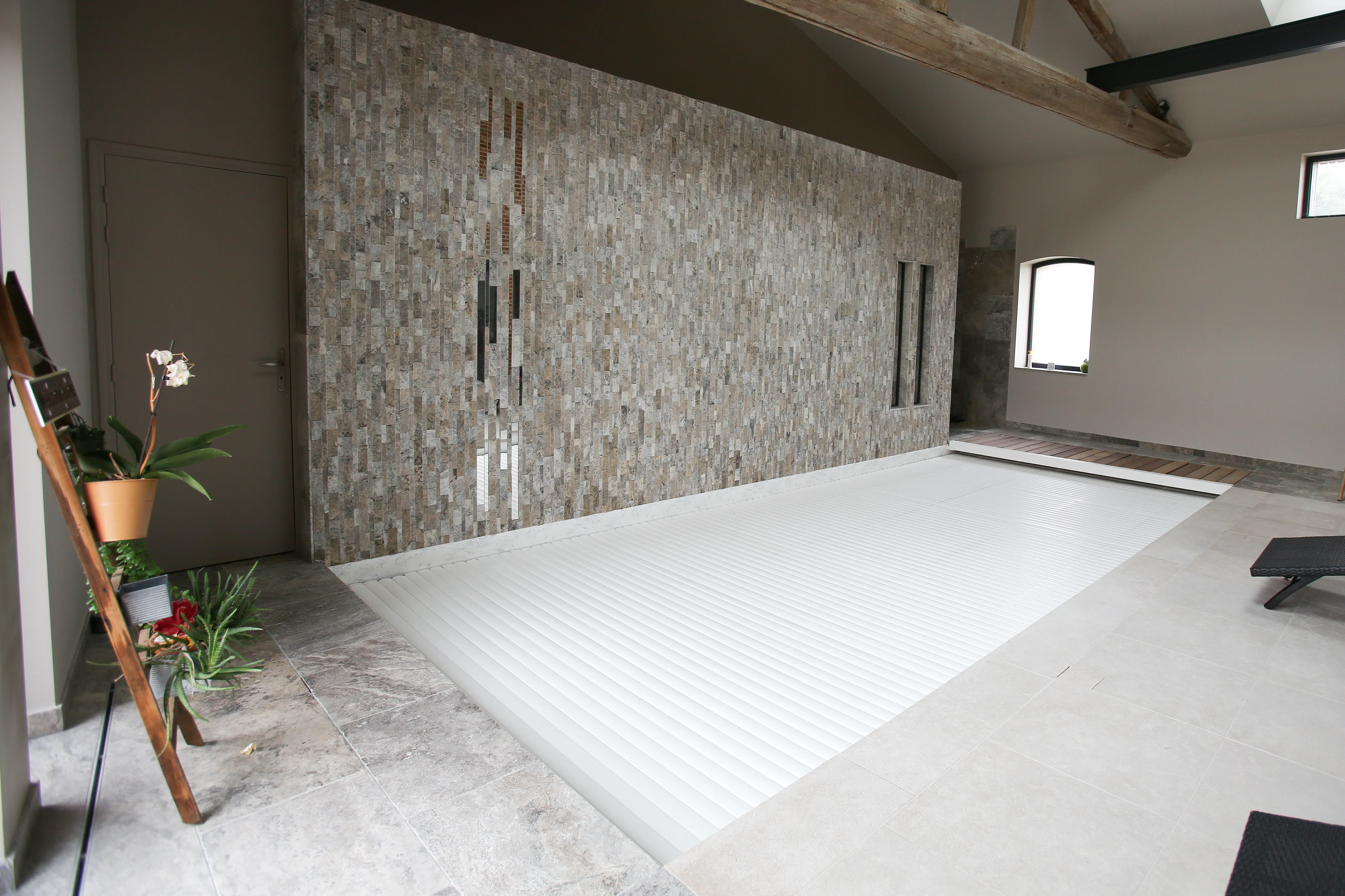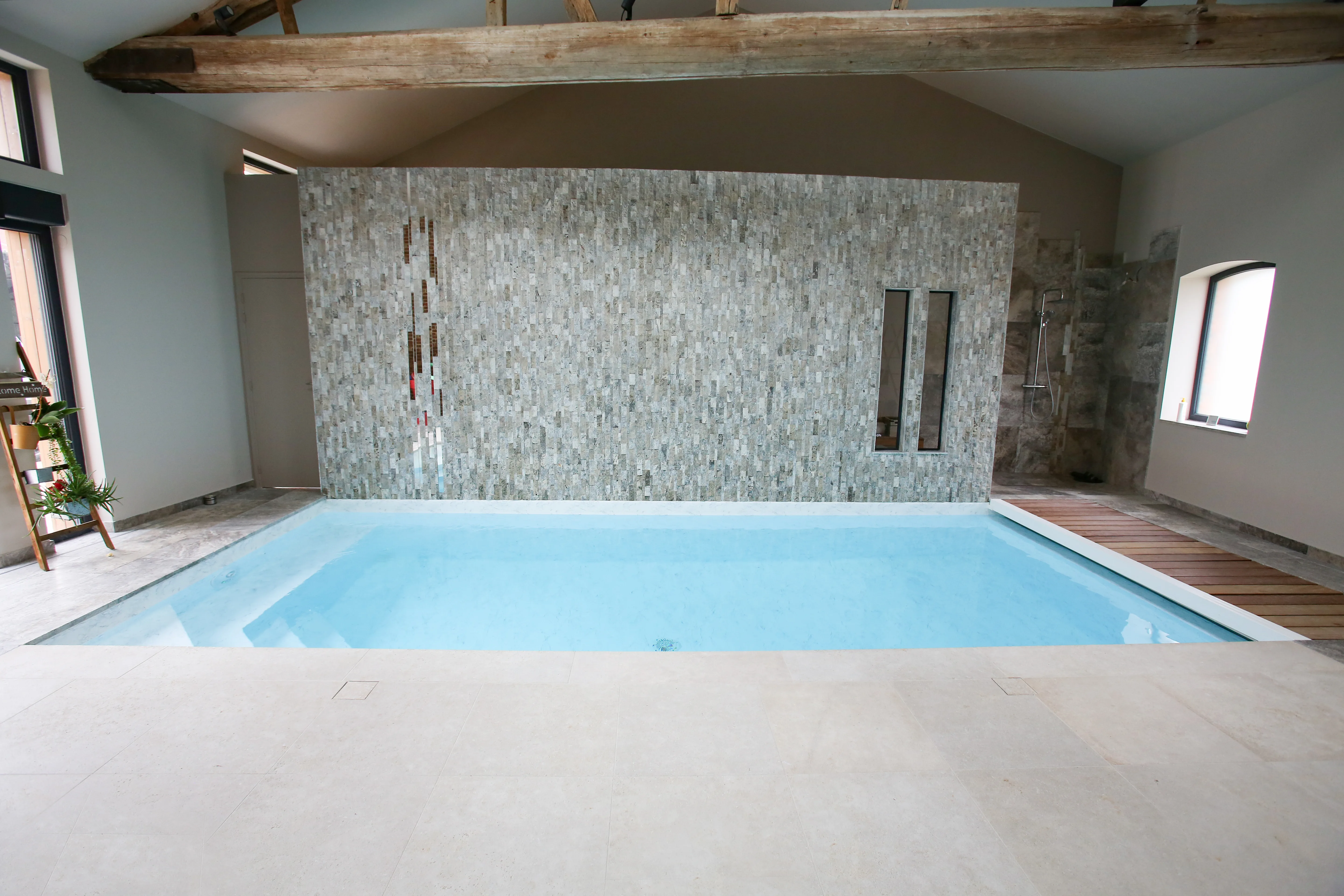 Piscine 3,00 x 7,50m fond plat 1,45m / escalier banquette et marches d’angle / PVC armé VANITY / panneaux Aquafeat / volet immergé OUT’DECK / pompe à chaleur / traitement DOMOPOOL (domotique) / Nage à contre courant / Déshumdificateur gainable avec rails