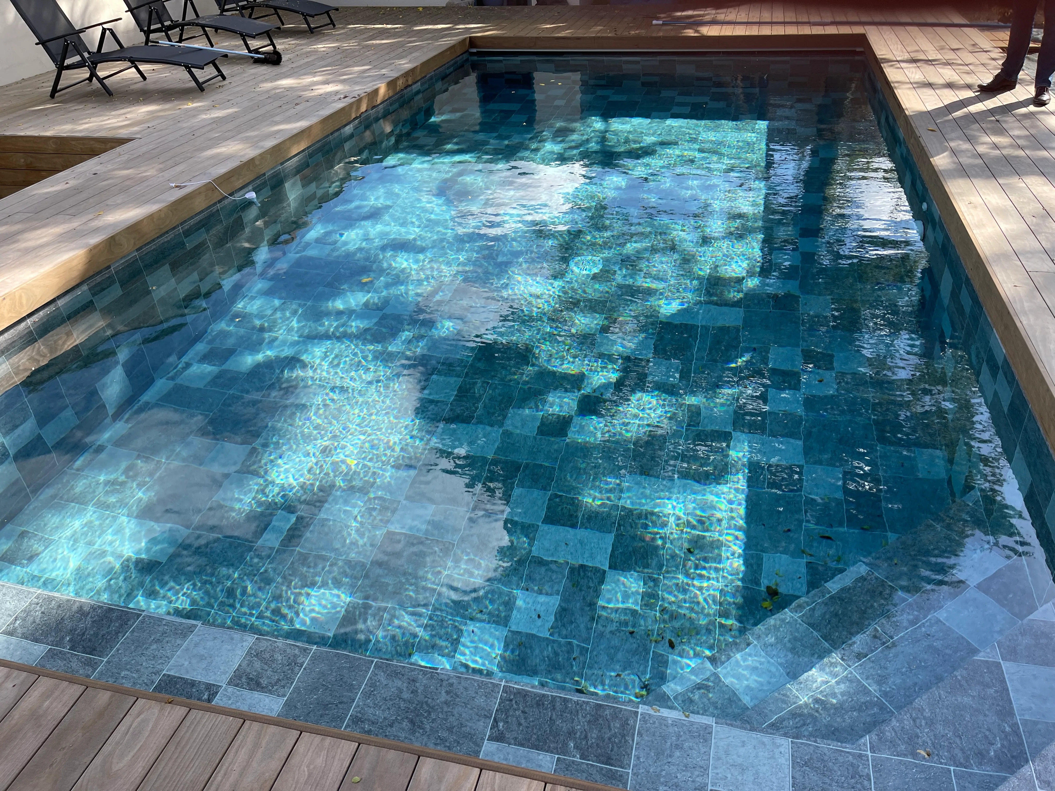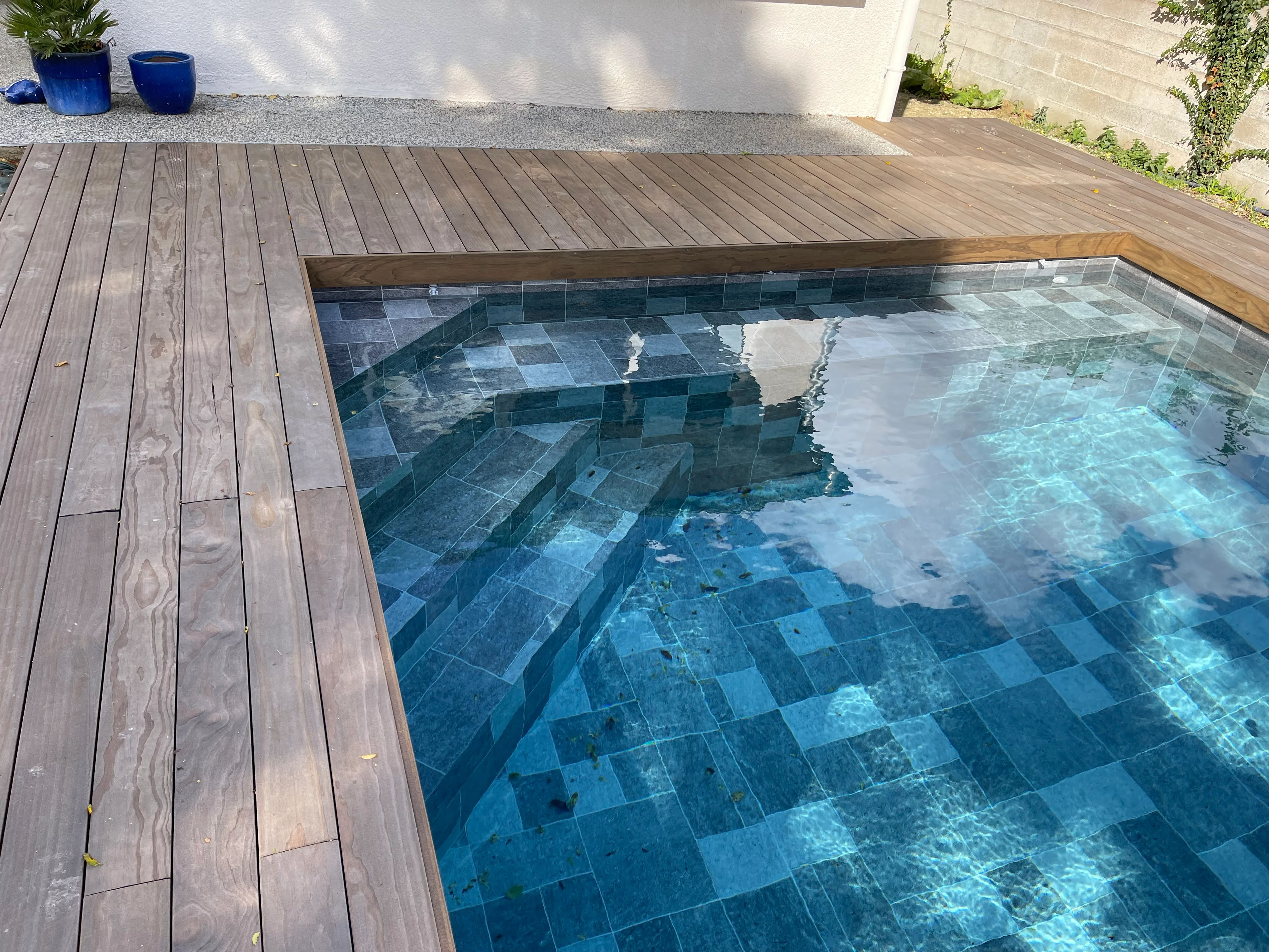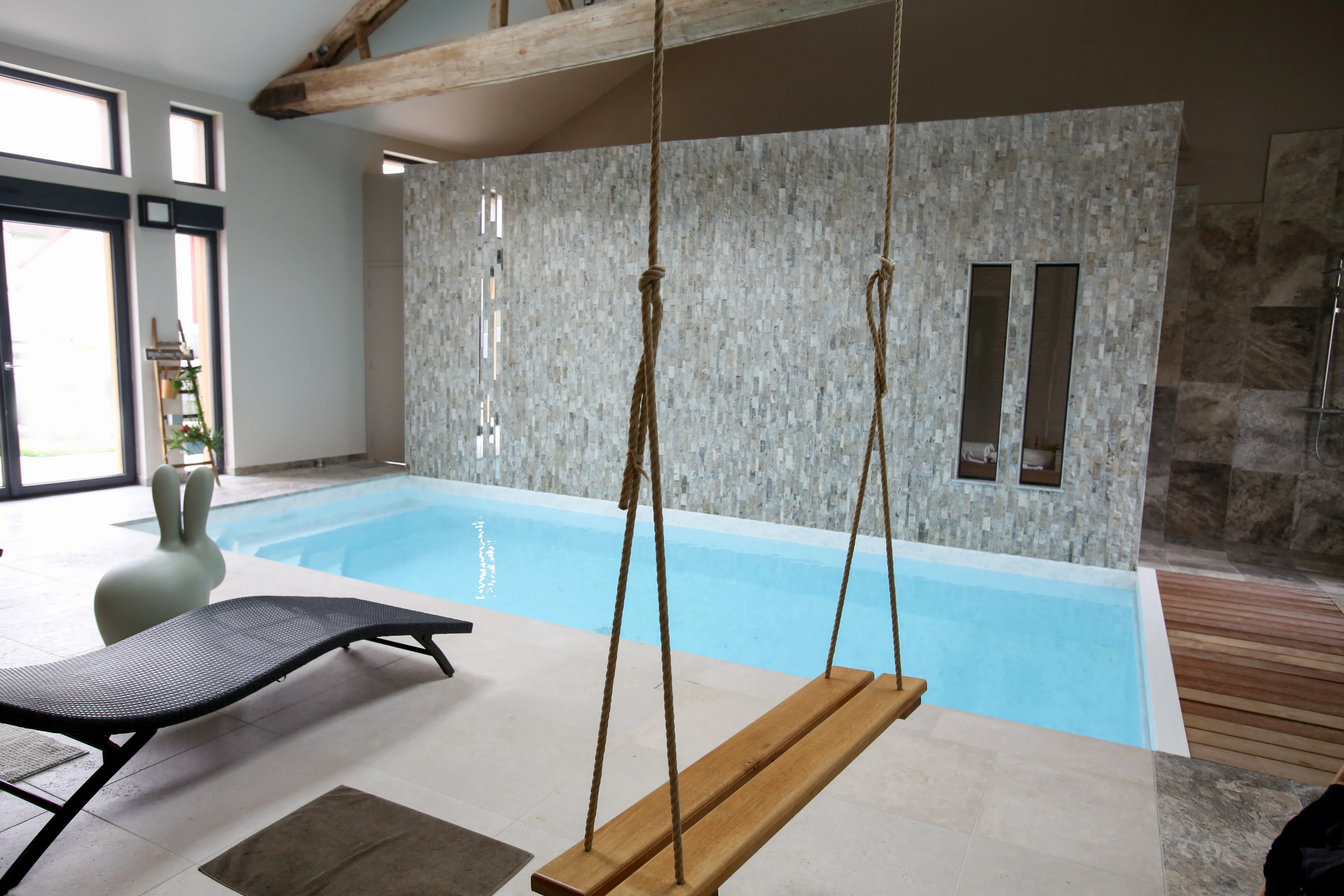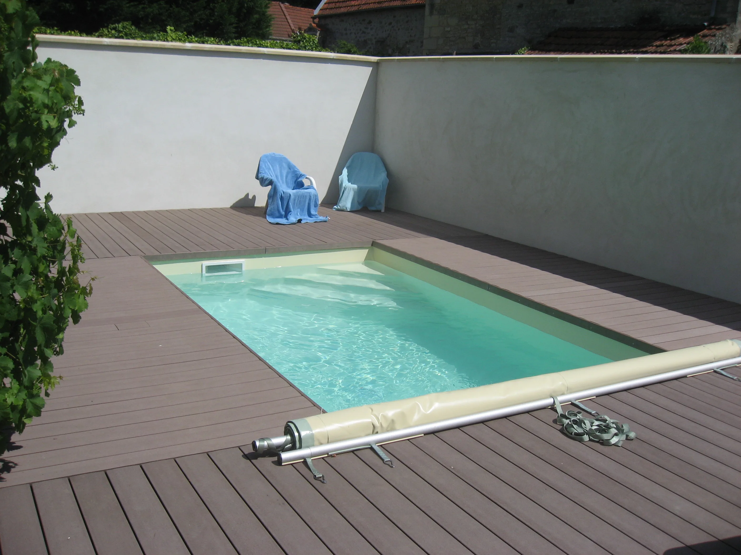 Piscine 3,00 x 7,50m fond plat 1,45m / escalier banquette et marches d’angle / PVC armé VANITY / panneaux Aquafeat / volet immergé OUT’DECK / pompe à chaleur / traitement DOMOPOOL (domotique) / Nage à contre courant / Déshumdificateur gainable avec rails